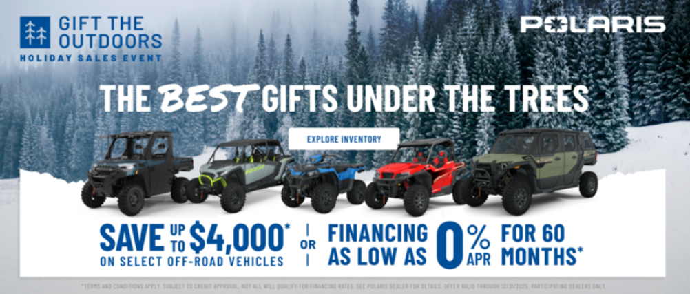 Polaris UTVs and ATVs on sale up to $4000 Off Select Off-Road Vehicles Financing as Low as 0% for 60 months.