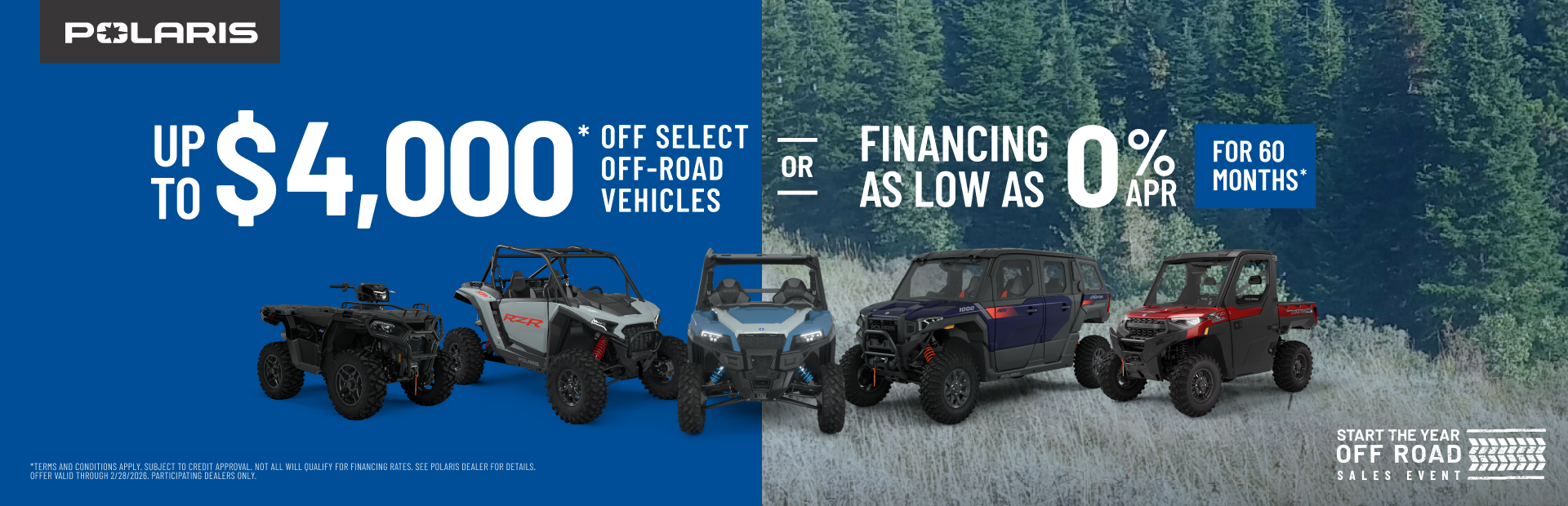 "Polaris UTVs and ATVs on sale up to $4000 Off Select Off-Road Vehicles Financing as Low as 0% for 60 months."